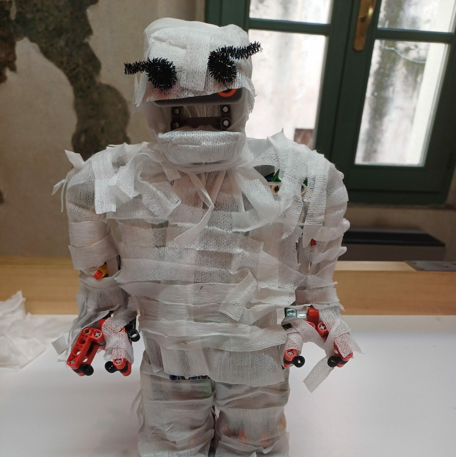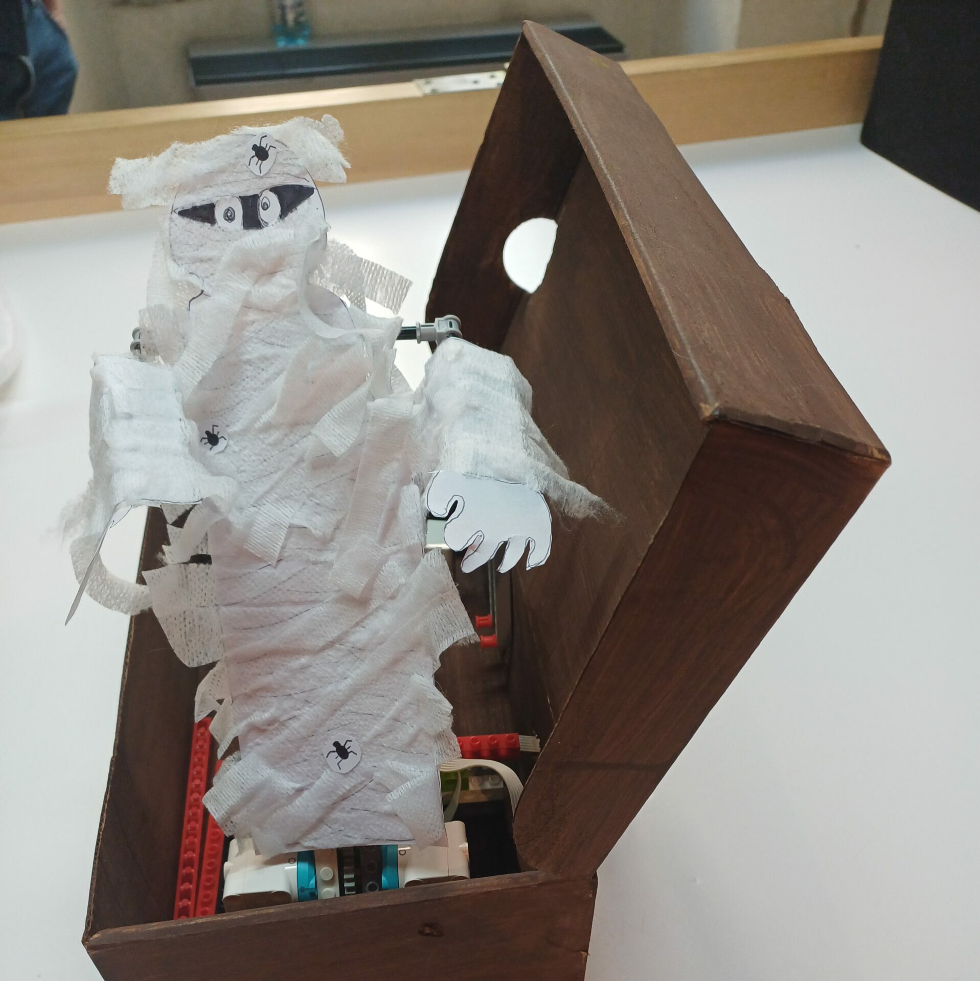 - costruzione con un gear train che consente alzata della mummia e quando è alzato consente di far alzare le braccia che necessita di 2 motori